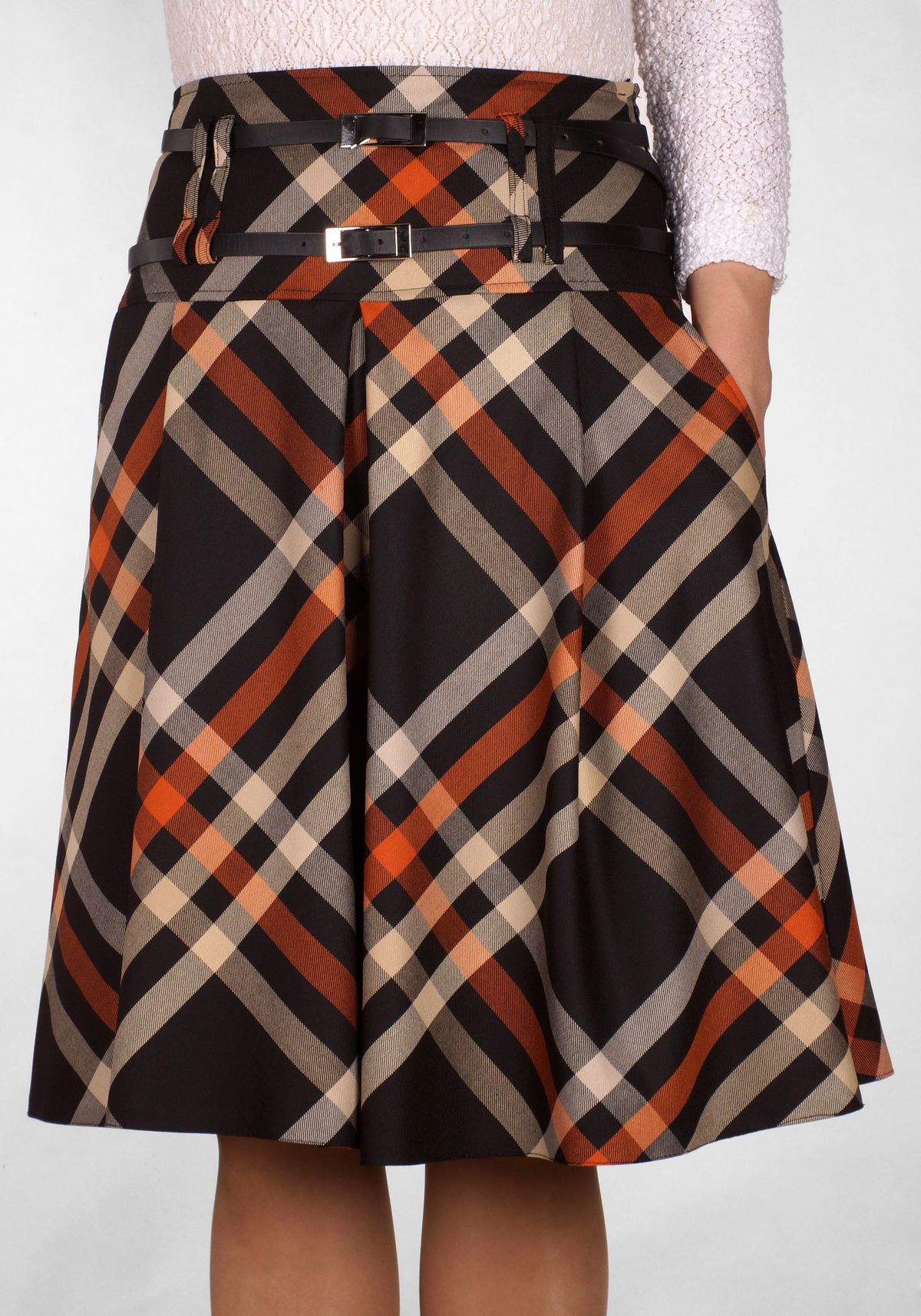 Юбка-колокол из модной клетчатой ткани.Модель с мягкими складками по переду,имеются удобные карманы.Ремни отдельно по 80 руб.