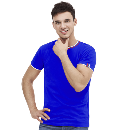 Футболка мужская с коротким рукавом и резинкой "триколор" по вороту. Рукава с контрастной обработкой и тесьмой "триколор". Фирменный принт по горловине. Материал повышенной упругости. Современные лекала и модный дизайн. Возможность нанесения различных видов печати.