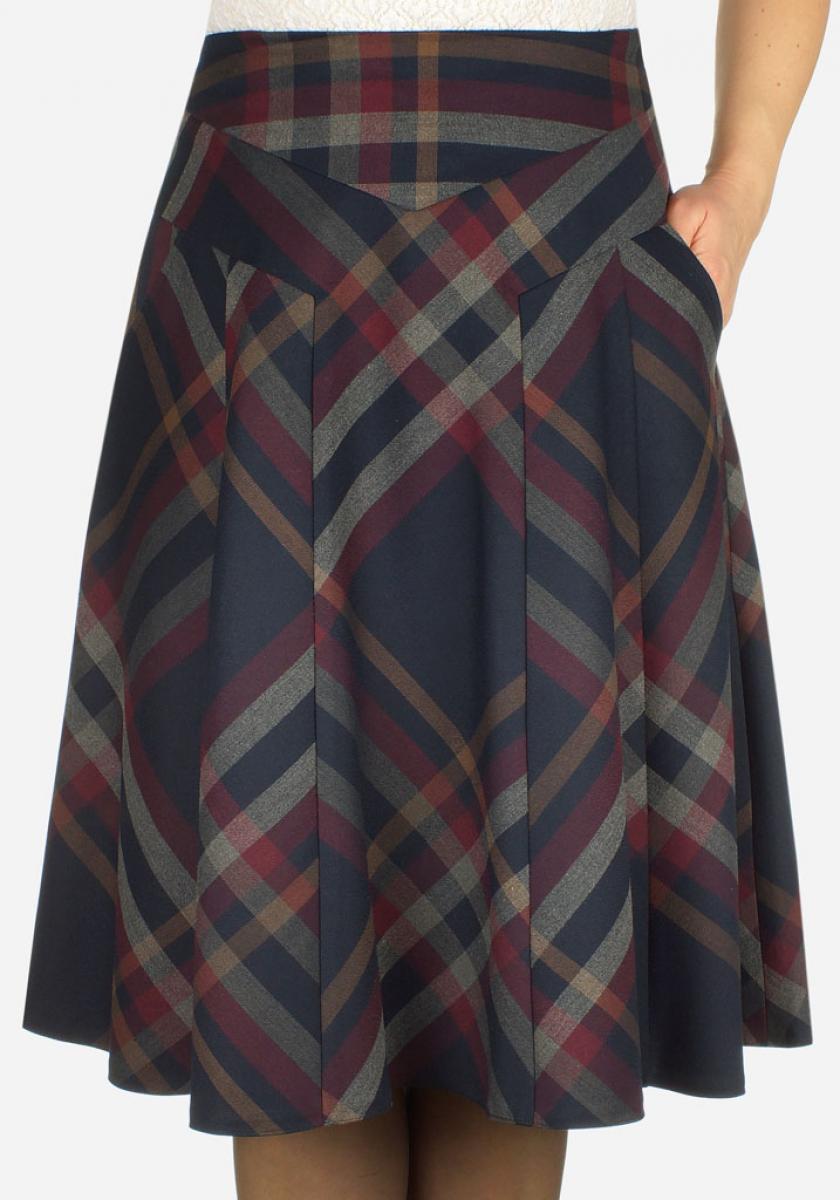 Эффектная модель сложного кроя на угловой кокетке с немного расклешонными клиньями.Спереди и сзади зеркальное отображение.Юбка с карманами по бокам на подкладе,замок с боку.