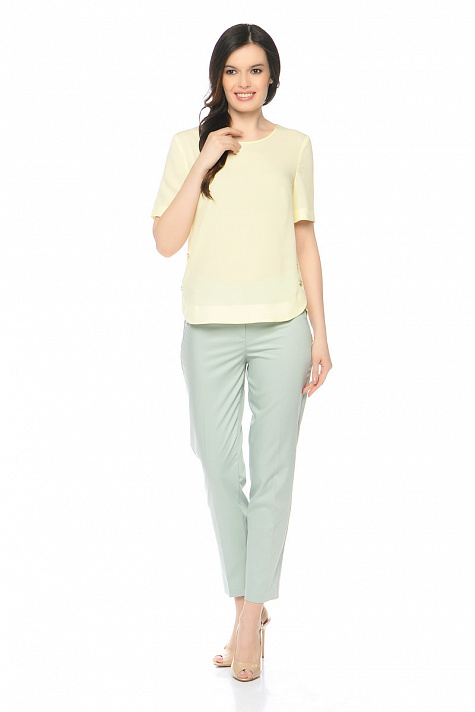 Брюки зауженные к низу длиной до щиколотки . Пояс частично на резинке , талия на естественном месте.