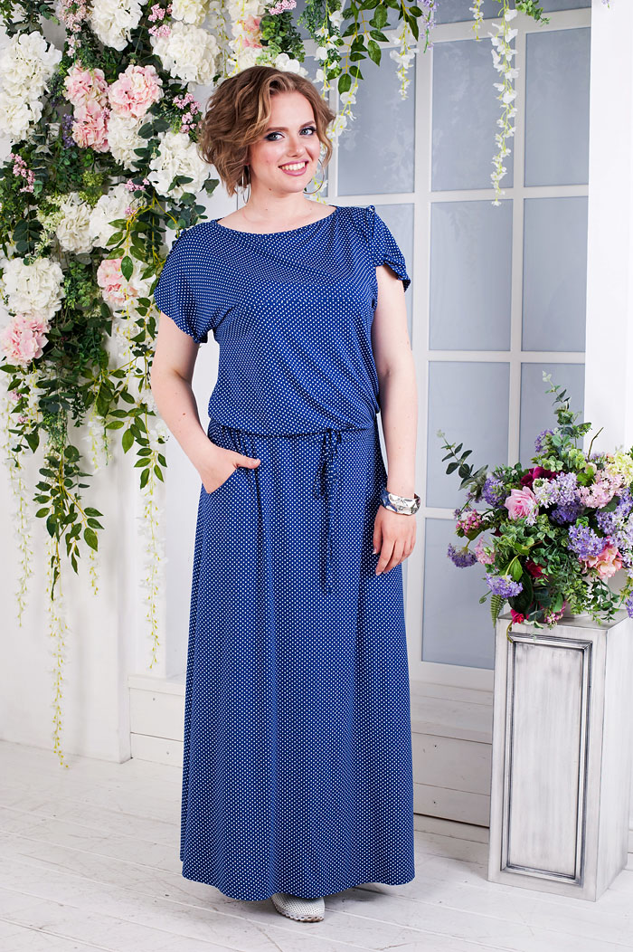 Платье темно-синего цвета в мелкий белый горошек станет Вашим любимым нарядом в новом сезоне. Идеально садится по фигуре, подчеркивая талию и скрывая недостатки благодаря кулиске. В платье предусмотрены кармашки.