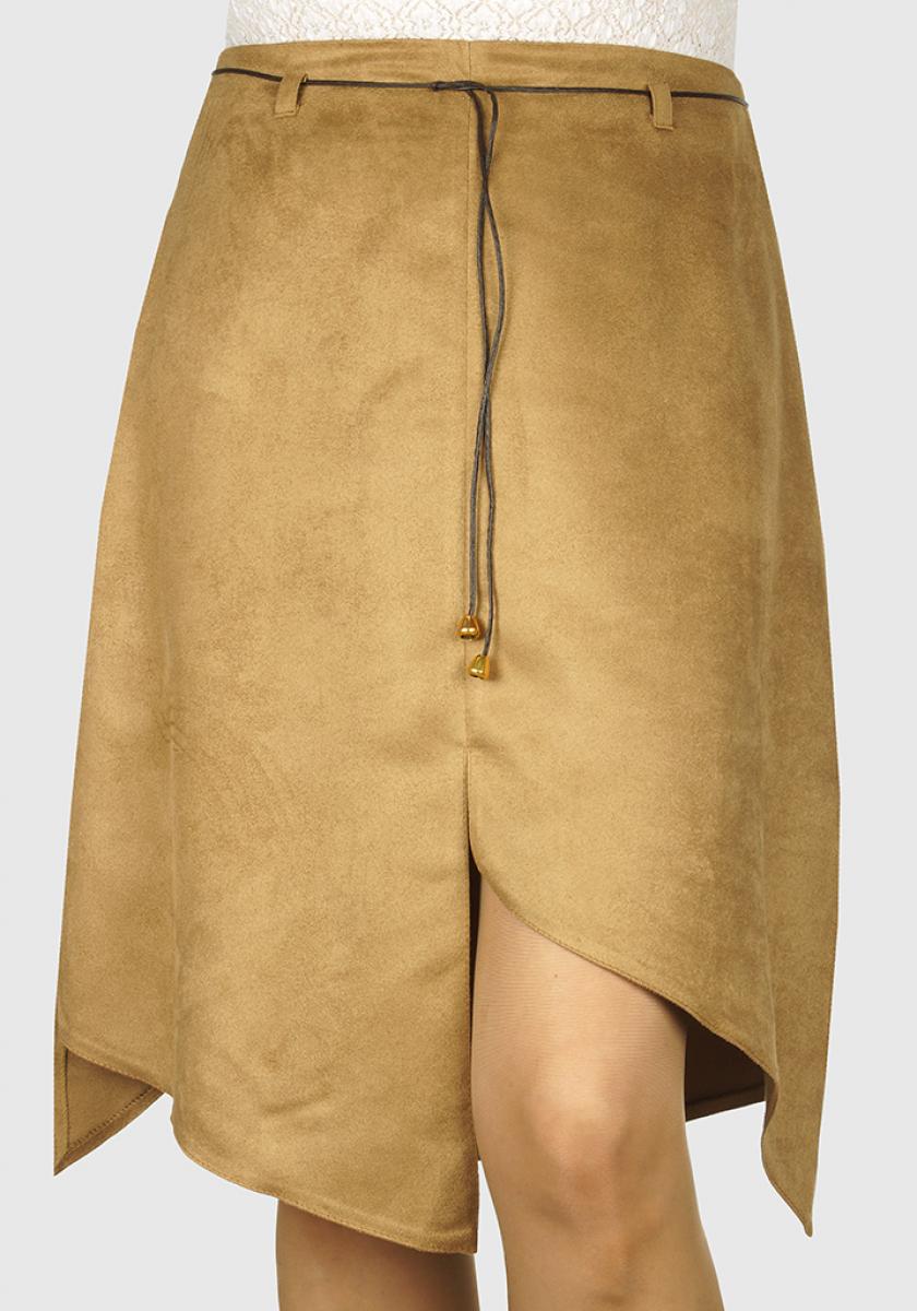 Юбка осеметричного кроя,зеркального отражения ткань напоминает структуру замши. В моде неровный срез подола геометрических форм, асимметричные вырезы. Коричневый является самым распространенным цветом для структуры замшевых моделей. В сочетании с нейтральными черными или белыми цветами сверху юбка из структуры замши способна создать очаровательный облик, который будет универсален для любого времени года