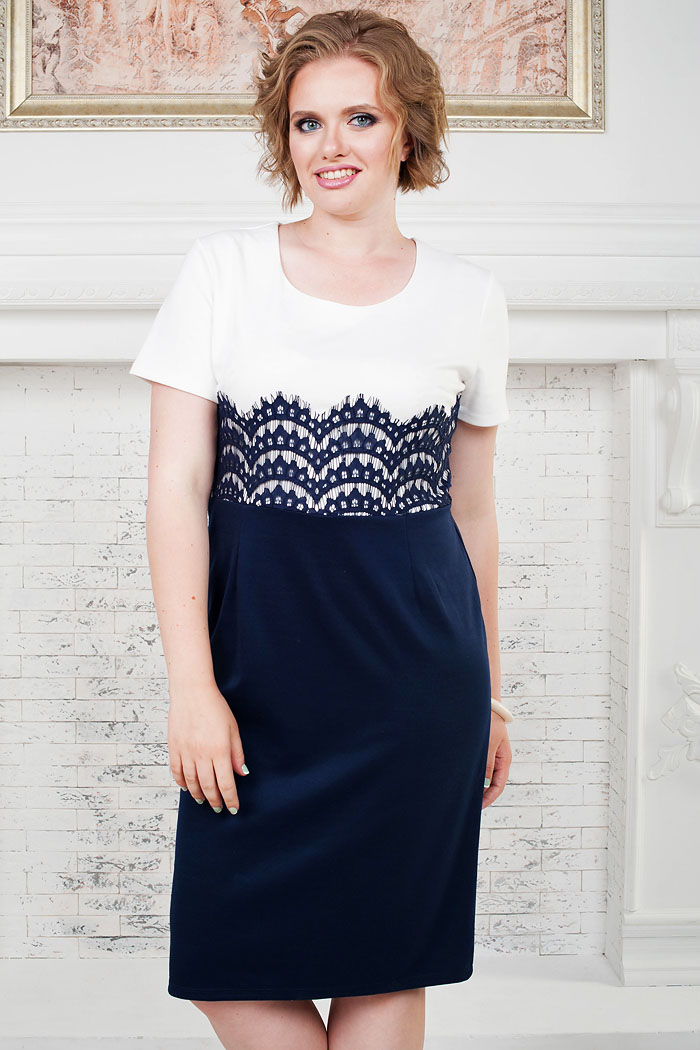 Летнее платье по фигуре, классическое сочетание темного низа и белого верха. Украшено на поясе кружевом. Платье из плотной ткани.