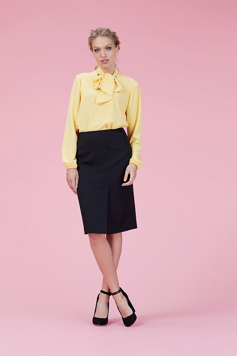 Юбка зайуженная к низу длиной до колен, пояс на обтачке, талия слегка занижена. На переднем полотнище - шлица в ассиметричном рельефе. Заднее полотнище с талевыми вытачками