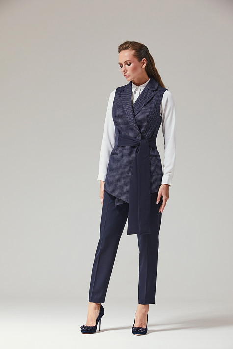 Жилет прилегающего силуэта с классическим воротником и поясом. Пояс втачан в рельефы на передней части изделия, спинка чистая с рельефами и средним швом. В жилете выполнены карманы в рамку. Дизайн жилета предполагает трансформацию из строгого офисного стиля в более повседневный "smart casual" за счет игриво повязаного в бант пояса.