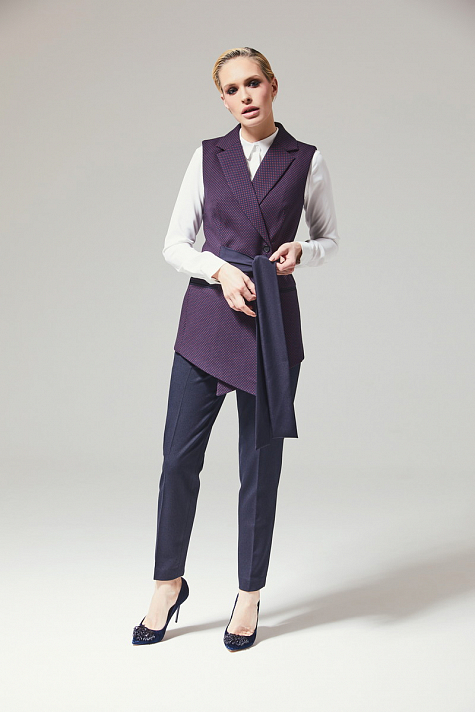 Жилет прилегающего силуэта с классическим воротником и поясом. Пояс втачан в рельефы на передней части изделия, спинка чистая с рельефами и средним швом. В жилете выполнены карманы в рамку. Дизайн жилета предполагает трансформацию из строгого офисного стиля в более повседневный "smart casual" за счет игриво повязаного в бант пояса.