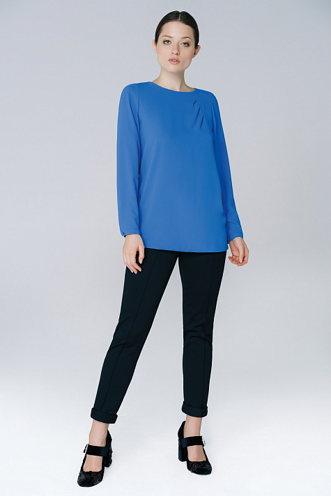 Блуза прямого силуэта, с объемными втачными рукавами. Горловина переда оформлена мягкими защипами, по низу рукава выполнена манжета с пуговицей. Легкая романтичная блуза отлично смотрится в сочетании с брючным костюмом и юбкой.