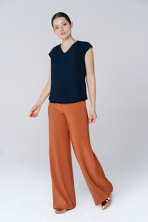 Блуза прямого силуэта с напуском на поясе и защипами на горловине, без рукавов. Легкая элегантная блуза, выполнененная в стиле минимализм, станет отличным дополнением к любому образу.