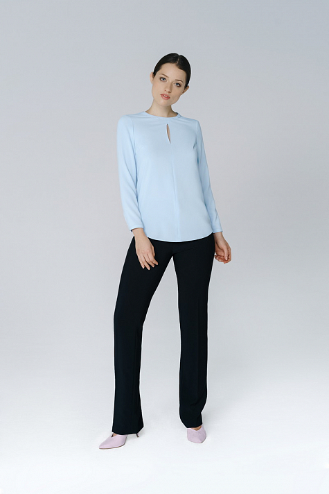 Блуза прямого силуэта с втачным рукавом и фигурным вырезом. На спинке и по низу рукава и горловине выполнена застежка "капля". Сдержанная элегантная блуза станет отличным дополнением офисного стиля.