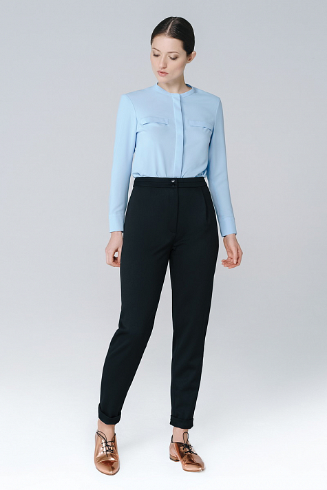 Брюки фасона "каррот" классической длины со стрелкой. На поясе расположена застежка на две пуговицы. Низ изделия оформлен манжетами.