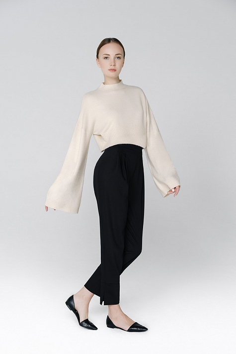 Брюки фасона "кэррот" с защипами на талии и поясом. По низу изделия выполнены манжеты с разрезами в боковом шве.