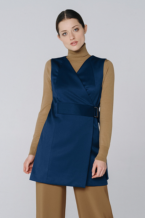 Жилет прямого силуэта с запахом и ремнем-застежкой. На переде и спинке выполнены декоративные рельефы. Горловина имеет V образный вырез.