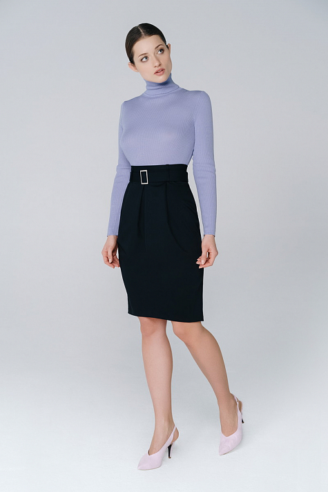 Юбка прямого силуэта с декоративным ремнем на поясе. На переде юбки выполнены два защипа , а также расположена складка по центру. На спинке по низу изделия в среднем шве выполнен разрез.