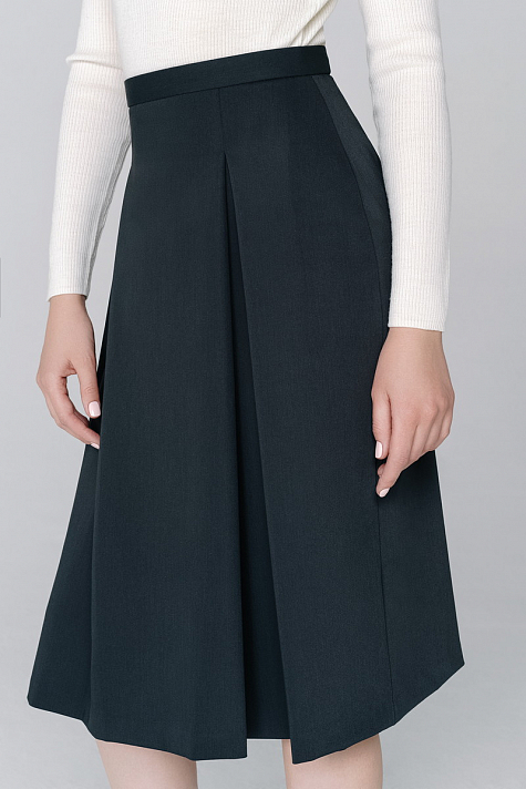 Юбка прямого силуэта на поясе. На переде изделия выполнены защипы, на спинке расположены два рельефа.
