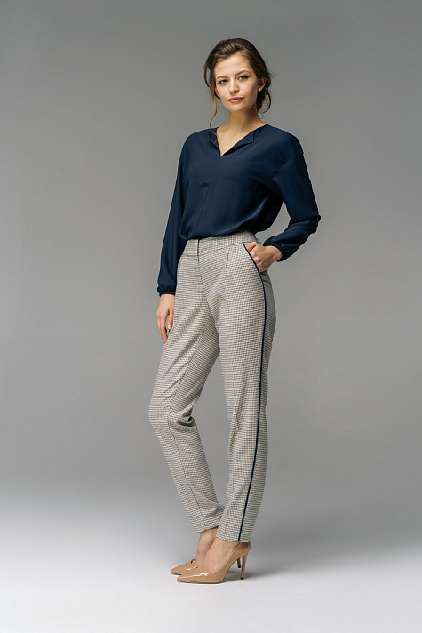 Брюки силуэта "морковки" длиной до щиколотки, на поясе , талия слегка занижена. Передние половинки брюк с боковыми функциональными карманами, с отделочным кантом переходящим в боковой шов. На правой задней половинке брюк карман в рамку.