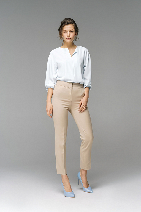 Зауженные брюки со стрелками и поясом на талии. В изделии выполнены карманы с отрезным бочком. Пояс брюк декорирован отстрочками. Отличное сочетание дизайна и практичности.