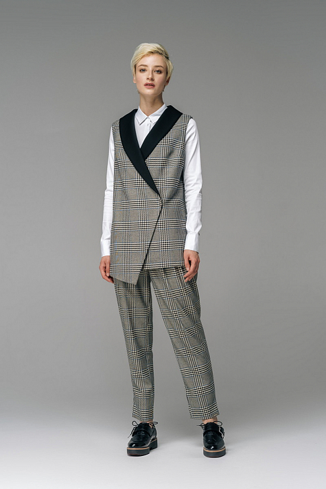 Двубортный жилет с воротником "шалька" и косым бортом. Стильный жилет отлично дополнит ваш образ. Идеально подойдет для офисного стиля и вечернего мероприятия, если добавить брошь.