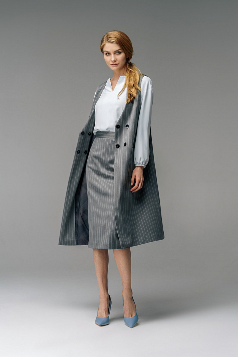 Жилет прямого силуэта с запахом и поясом, с накладными карманами. Жилет, выполненный в стиле минимализм, подчеркнет современность и элегантность вашего образа
