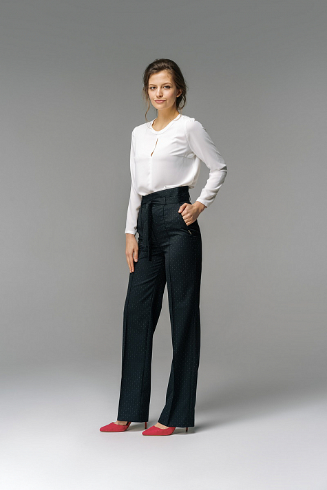 Прямые брюки классической длины с талиевыми вытачками и поясом.