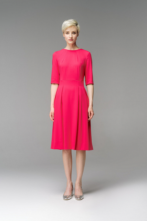 Платье прилегающего силуэта с V-образным вырезом на спинке. На горловине выполнены диагональные вытачки. На талии расположены встречные складки, создающие объемную пышную юбку. На спинке в среднем шве расположена металлическая молния. Плавные линии и приталенный фасон платья подчеркнут женственность и романтичность образа.