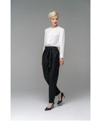 Брюки силуэта "каррот", зауженные к низу, с защипами спереди и поясом. В изделии выполнены карманы в боковом шве. Отличный вариант на каждый день. Пояс, повязаный в бант, придаст романтичности вашему образу.