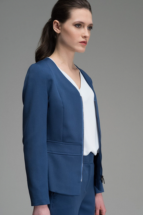 Жакет прилегающего силуэта с центральной застежкой-молнией и с декоративным подрезом по линии талии. Прилегающий силуэт и V - образный вырез подчеркнут достоинства вашей фигуры.