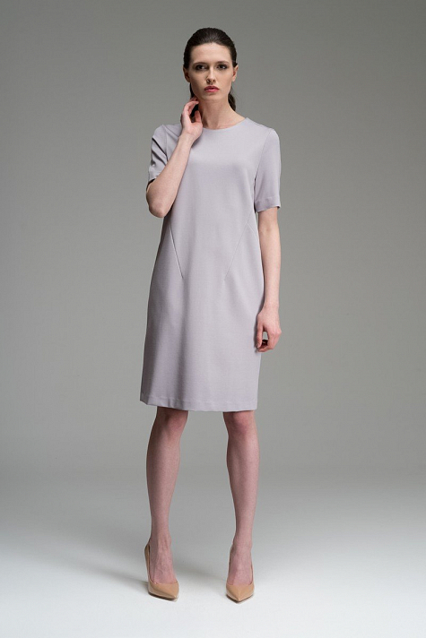 Платье прямого силуэта с декоративными подрезами длиной до линии колена. Втачной короткий рукав оформлен манжетой. Горловина изделия имеет круглую форму.