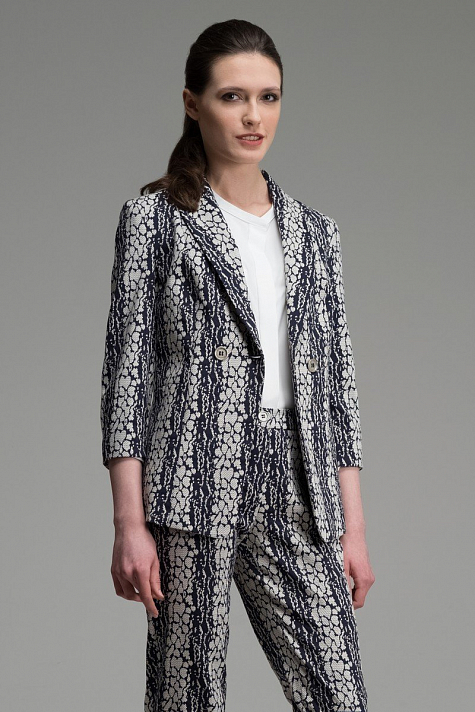 Двубортный жакет прилегающего силуэта с декоративными рельефами и застежкой на две пуговицы. Укороченный втачной рукав с локтевой вытачкой, воротник шалька.