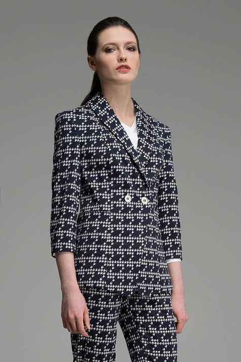 Двубортный жакет прилегающего силуэта с декоративными рельефами и застежкой на две пуговицы. Укороченный втачной рукав с локтевой вытачкой, воротник шалька.