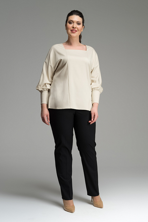 Романтичная блуза прямого силуэта с рукавом покроя "баранья нога". На передней части блузки расположены два рельефа.