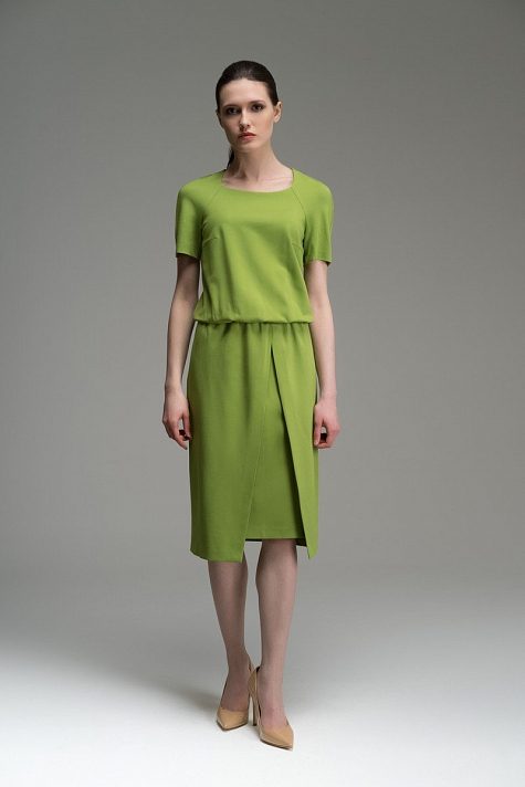 Платье прилегающего силуэта с напуском по линии талии и декоративным разрезом.