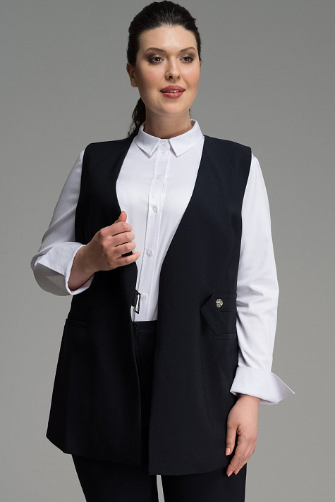 Жилет полуприлегающего силуэта длиной чуть ниже бедер. Спинка со средним швом и талевыми вытачками, полочка с талевымыми вытачками и карманом "рамка".