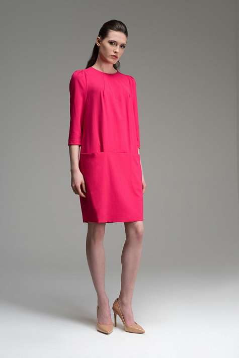 Платье "О"- образного силуэта с втачным рукавом и карманами в шве. На линии горловины выполнены диагональные вытачки, на спинке в среднем шве расположена металлическая молния. Элегантная и универсальная модель платья станет отличным дополнением офисного и вечернего гардероба.