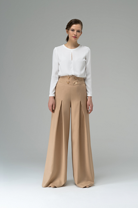 Брюки палаццо удлиненные с широким поясом. В области талиевых вытачек выполнены декоративные встречные складки.