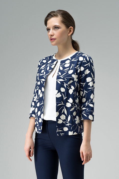 Жакет полуприлегающего силуэта без застежки и подкладки. Рукав длиной 3/4 . На полочке фигурные вытачки от бокового шва. Длина изделия ниже линии талии на 10 см.